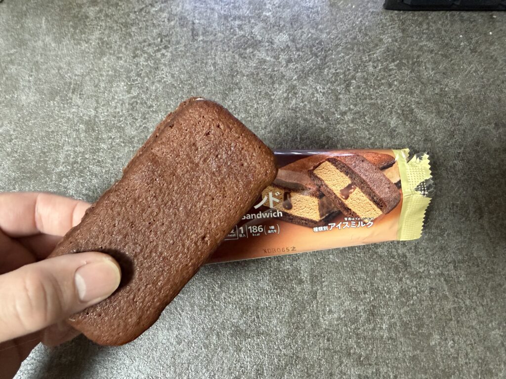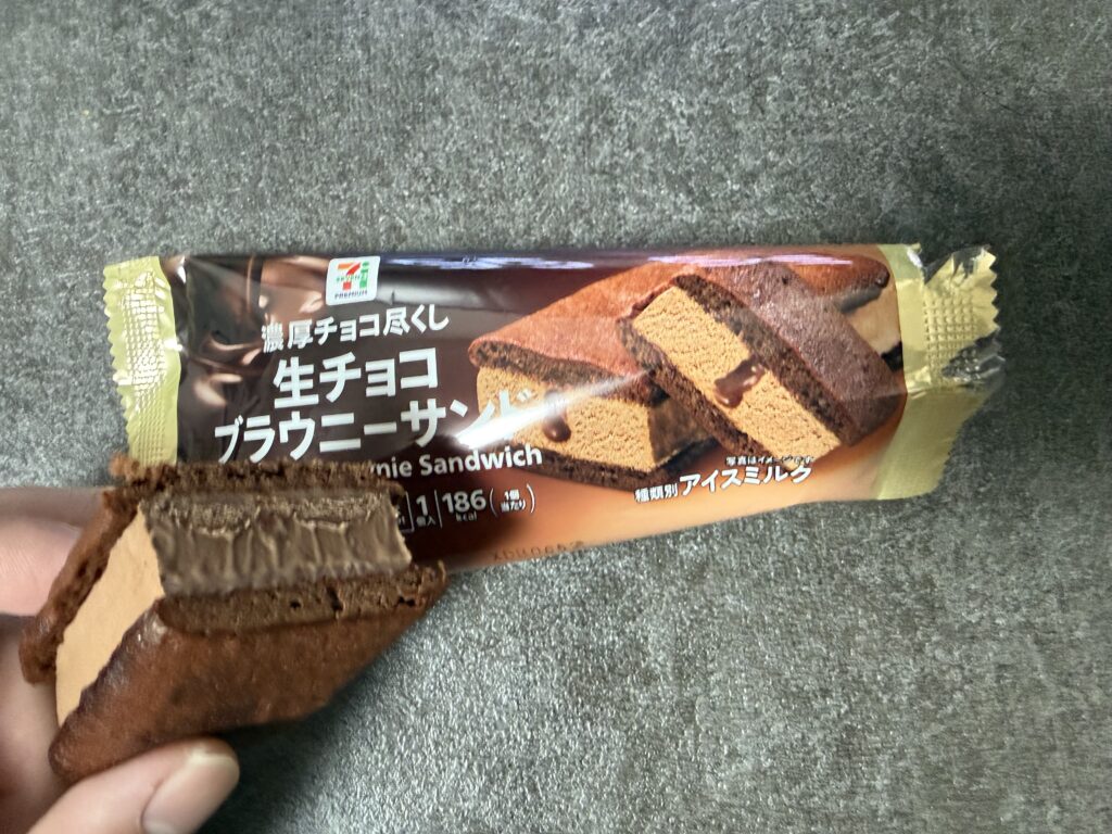 ブラウニーがしっとり、ぎゅっと詰まっていて満足感があるというポイントかなと思います。パサパサではなく、少しねちっとした食感で、クッキーサンドとケーキアイスの良いところを足して割ったような口当たりはハマりそうでした!