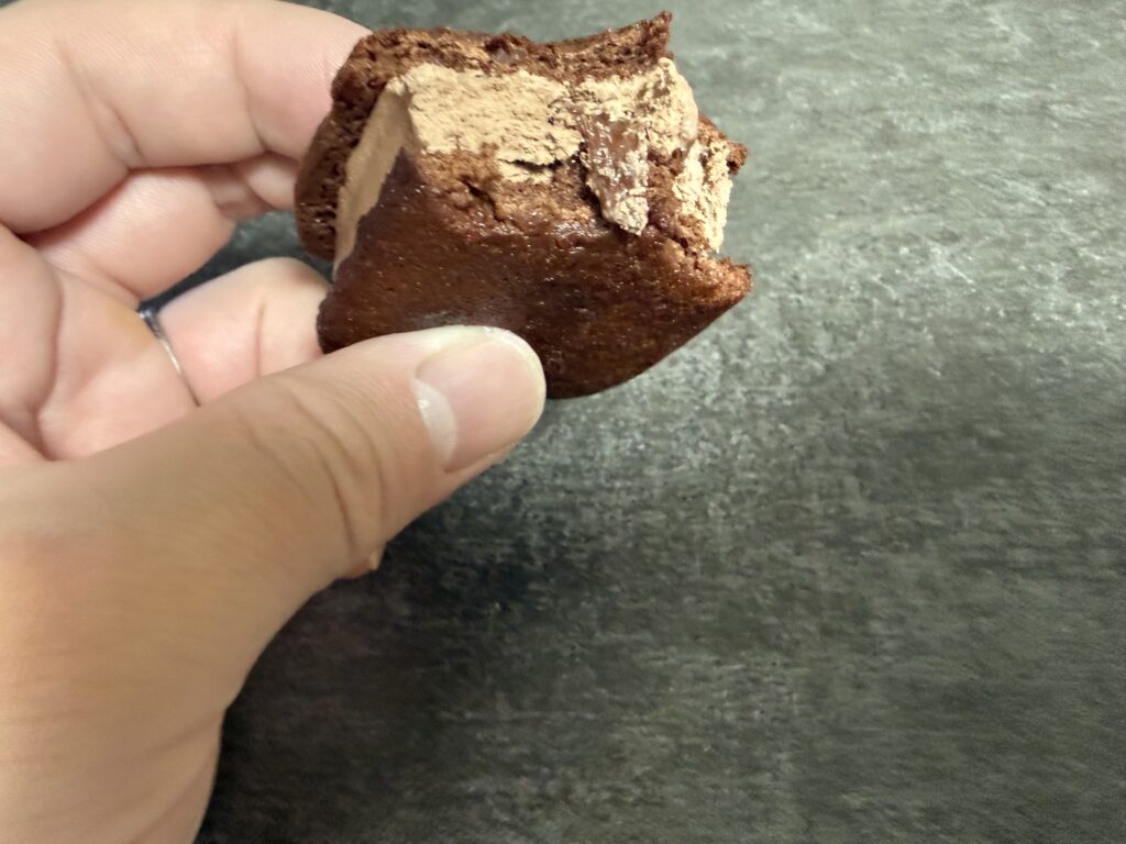 中のチョコアイスはなめらかで口どけが良く、その中心に入っている生チョコソースがとろっと溶けてくることで、濃厚さが一気に加速します。チョコの甘さの中にほろ苦さもあって大人っぽくてビターチョコ好きにも刺さるような味わいです。単なる甘々スイーツではなく、しっかりカカオ感を感じたい人にも向いている印象でした。